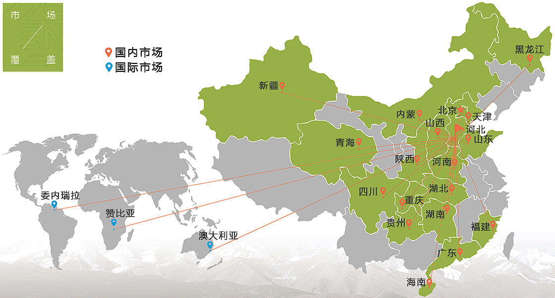 業(yè)務(wù)輻射——國(guó)內(nèi)的華北五省區(qū)市、西北新疆、青海及河南、山西、山東、福建、廣東、海南等地,海外業(yè)務(wù)延伸至澳大利亞、贊比亞、委內(nèi)瑞拉等國(guó)家,